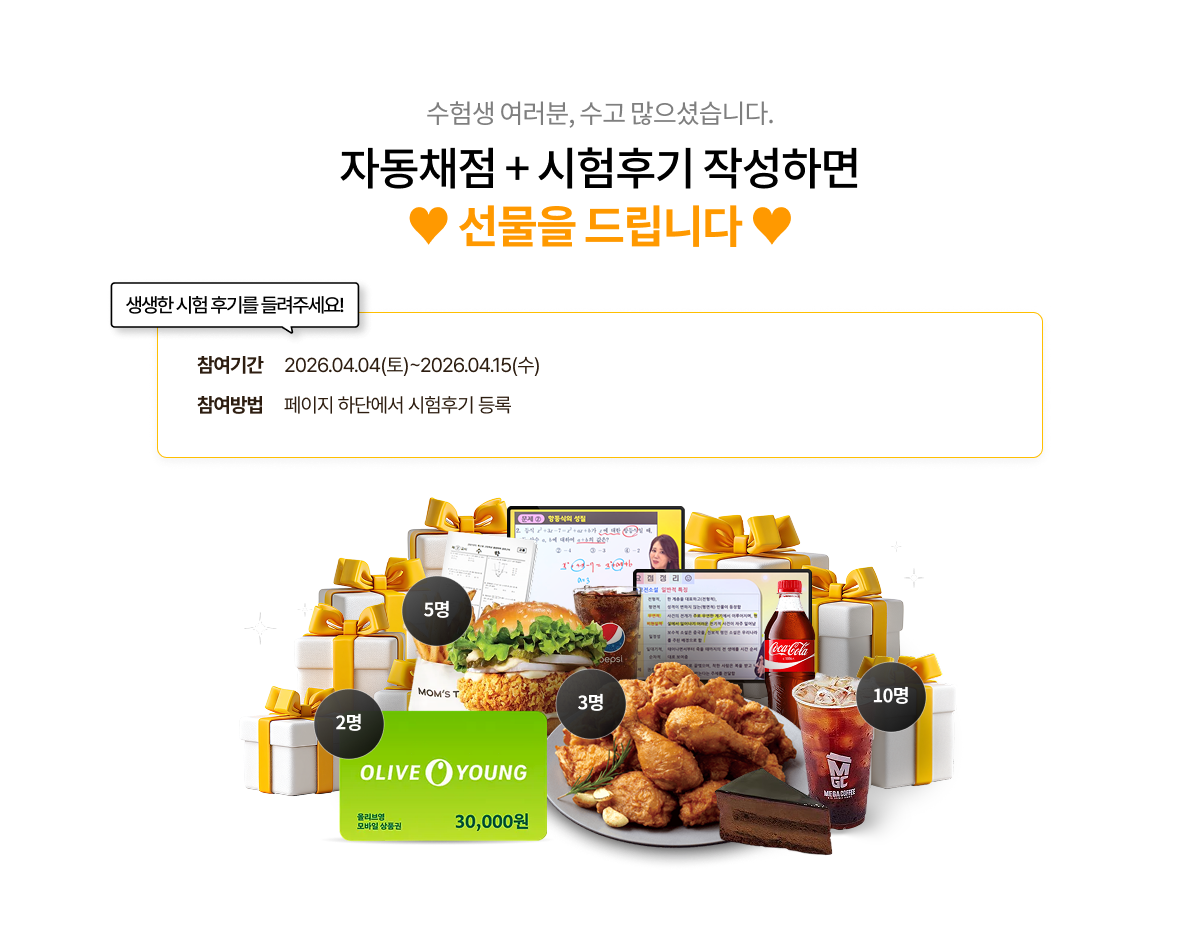 - 경품은 자동채점 후 시험후기를 작성한 분들 중에서 추첨을 통해 선정되며, 2026년 4월 말 발송 예정입니다.